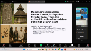 Studium Generale yang menjadi bagian penting dari rangkaian acara menghadirkan dua narasumber nasional, Dr. Ratih Baiduri, M.Si., dan Dr. Mhd. Ilham, S.Ag., S.Sos., M.Hum. Dalam pemaparannya, Dr. Ratih Baiduri, M.Si menekankan pentingnya pendekatan interdisipliner dalam memahami sejarah Islam. Ia menyebutkan bahwa sejarah Islam tidak cukup ditelusuri hanya melalui teks klasik atau kitab tarikh semata, tetapi juga harus diperkuat dengan sumber-sumber alternatif seperti artefak, struktur sosial masyarakat, dan ekspresi budaya—mulai dari seni, tulisan, hingga lisan. “Artefak seperti nisan, keramik, masjid tua, hingga manuskrip bergambar bisa menjadi pintu masuk untuk menelusuri dinamika kehidupan umat Islam di masa lampau,” jelasnya.