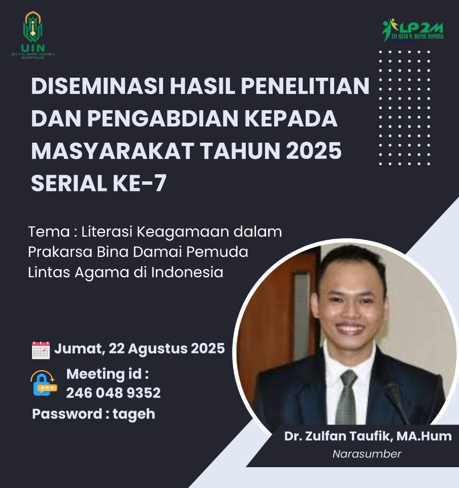 Bukittinggi – Fakultas Ushuluddin, Adab, dan Dakwah (FUAD) UIN Sjech M. Djamil Djambek Bukittinggi menegaskan komitmennya dalam pengembangan ilmu yang responsif terhadap realitas kebangsaan melalui riset dan diseminasi keilmuan. Komitmen ini tercermin dalam Diseminasi Serial ke-7 yang digelar LP2M UIN Bukittinggi pada Jumat (22/8/2025), menghadirkan Dr. Zulfan Taufik, MA.Hum., dosen FUAD, sebagai narasumber utama dengan paparan berjudul “Literasi Keagamaan dalam Prakarsa Bina Damai Pemuda Lintas Agama di Indonesia.”