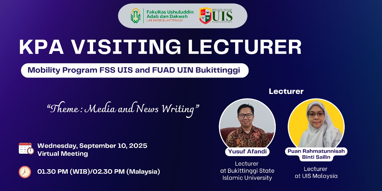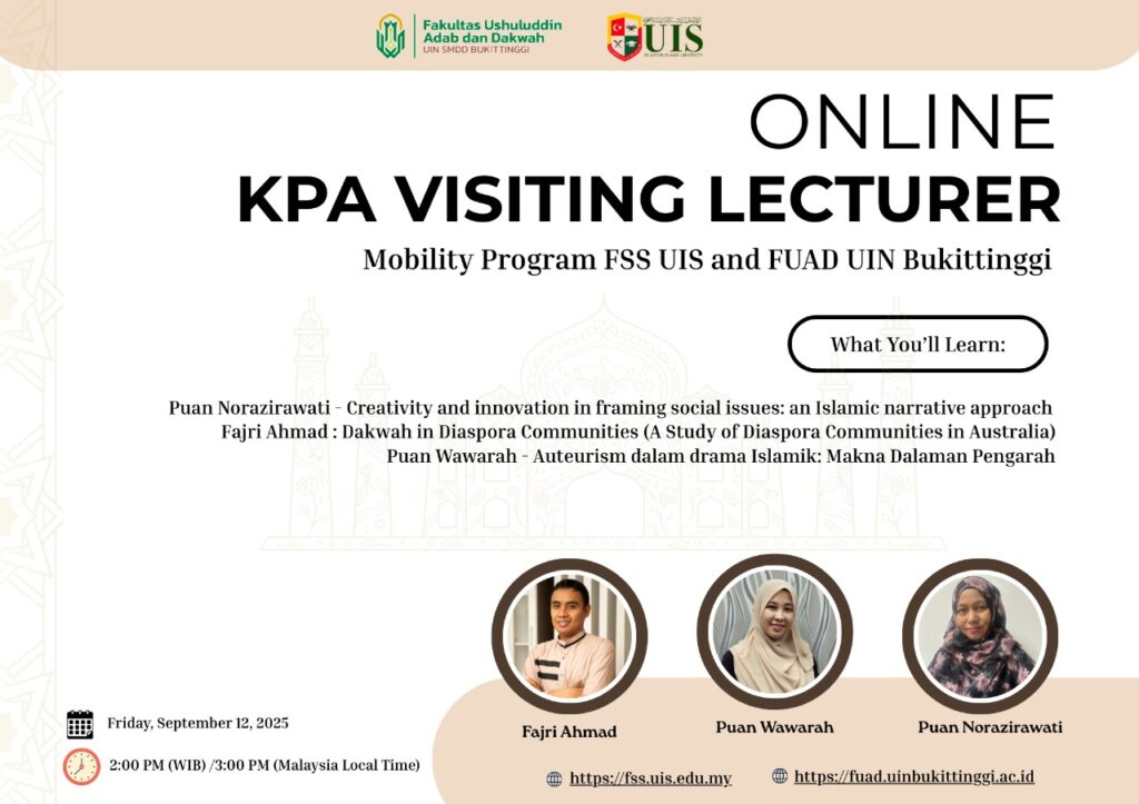 12 September 2025: Online KPA Visiting Lecturer menghadirkan tiga narasumber, yaitu Puan Norazirawati (Creativity and Innovation in Framing Social Issues: An Islamic Narrative Approach), Fajri Ahmad (Dosen KPI UIN Bukittinggi) (Dakwah in Diaspora Communities: A Study of Diaspora Communities in Australia), dan Puan Wawarah (Auteurism dalam Drama Islamik: Makna Dalaman Pengarah).