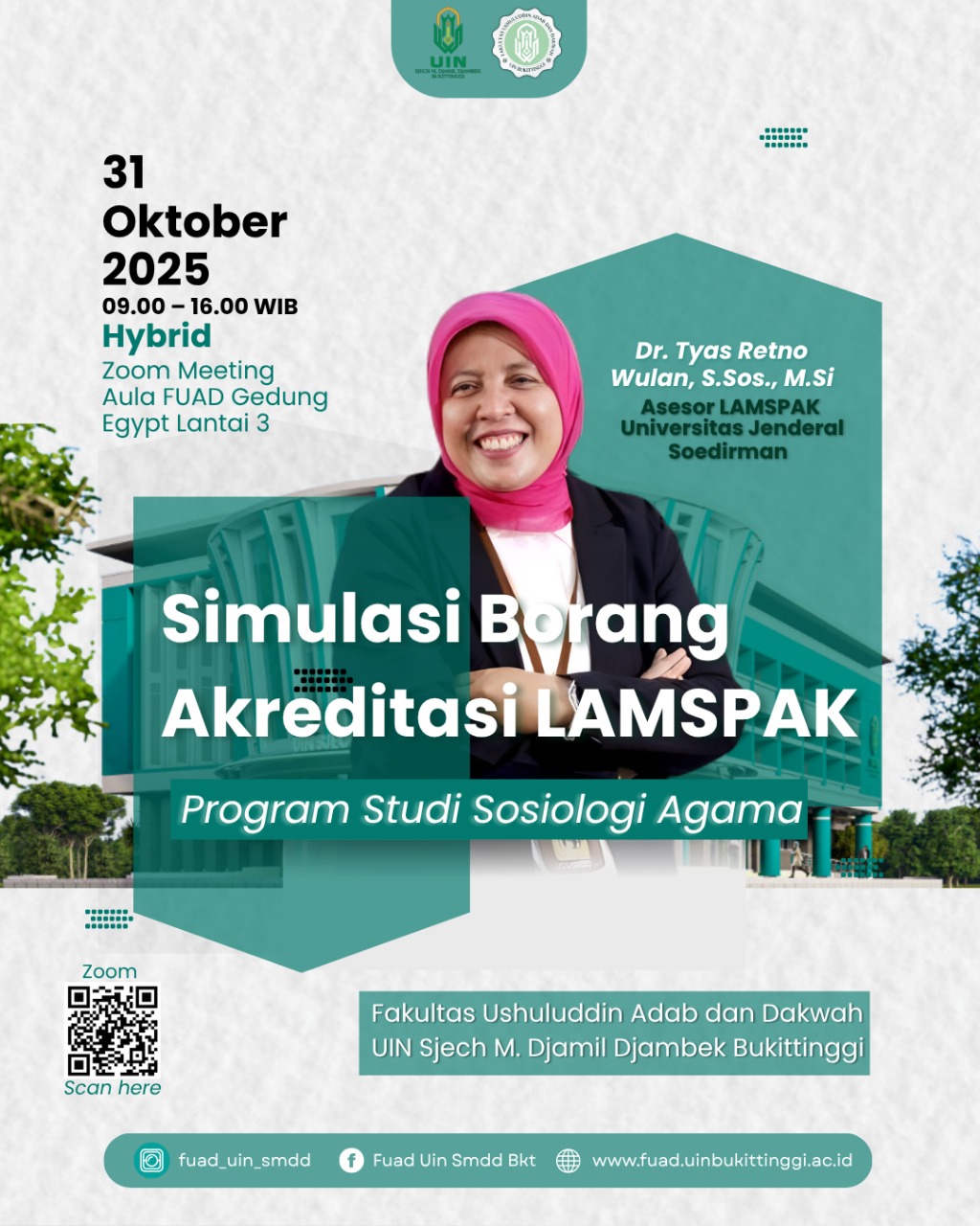 Bukittinggi, 31 Oktober 2025 — Fakultas Ushuluddin, Adab dan Dakwah (FUAD) UIN Sjech M. Djamil Djambek Bukittinggi menyelenggarakan kegiatan Simulasi Borang Akreditasi LAMSPAK sebagai bagian dari komitmen fakultas dalam memperkuat mutu akademik dan mendukung percepatan akreditasi Program Studi Sosiologi Agama yang akan segera melakukan submit borang ke LAMSPAK (Lembaga Akreditasi Mandiri Sosial Politik Administrasi dan Komunikasi).