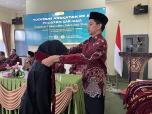Puncak prosesi yudisium ditandai dengan pembacaan Keputusan Dekan oleh Kepala Bagian Tata Usaha, Ratnawilis, S.Ag., MM., yang secara administratif mengesahkan kelulusan para mahasiswa. Momen ini dilanjutkan dengan pemasangan selempang yudisium oleh ketua program studi masing-masing kepada para lulusan, sebagai simbol legitimasi akademik sekaligus pengakuan atas capaian studi yang telah ditempuh. Ekspresi haru dan kebanggaan tampak jelas di wajah para lulusan, mencerminkan perjalanan panjang yang telah dilalui dengan penuh dedikasi dan ketekunan.