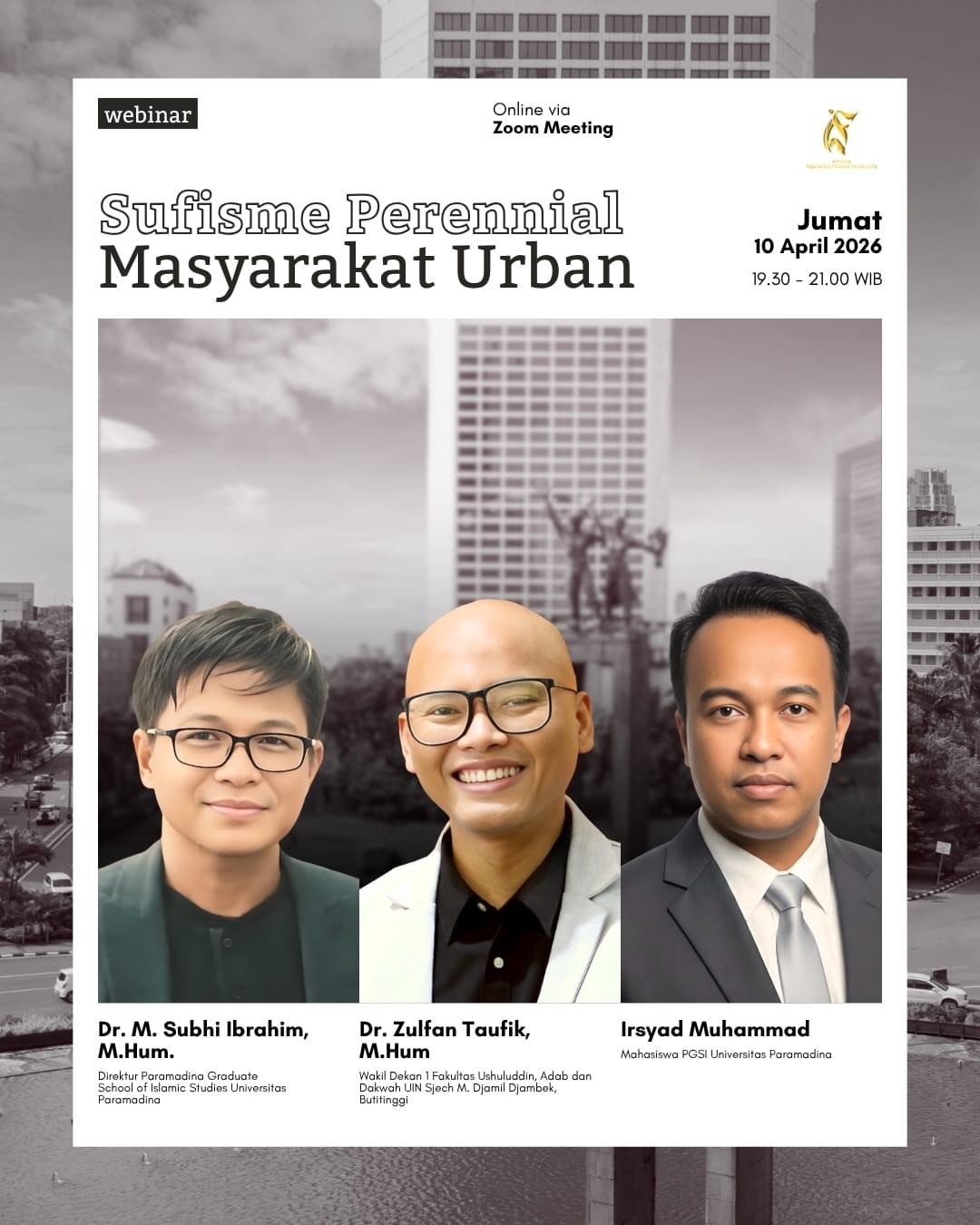 Dosen Fakultas Ushuluddin, Adab, dan Dakwah (FUAD) UIN Sjech M. Djamil Djambek Bukittinggi, Dr. Zulfan Taufik, tampil sebagai narasumber utama sekaligus pembicara pertama dalam Webinar Nasional yang diselenggarakan oleh Asosiasi Aqidah dan Filsafat Islam (ASAFI) dengan tema “Sufisme Perenial Masyarakat Urban”, Jumat (10/04/2026) secara daring melalui Zoom Meeting.