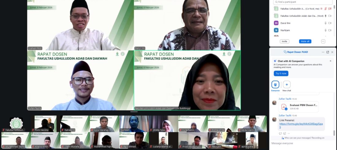 Bukittinggi — Fakultas Ushuluddin, Adab dan Dakwah (FUAD) UIN Sjech M. Djamil Djambek Bukittinggi menyelenggarakan Rapat Dosen FUAD dengan agenda utama Evaluasi Proses Belajar Mengajar (PBM) Semester Ganjil Tahun Akademik 2025/2026 serta Perencanaan PBM Semester Genap Tahun Akademik 2025/2026. Rapat dilaksanakan secara daring melalui Zoom...Read More