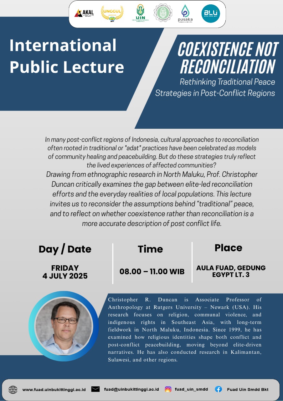 Fakultas Ushuluddin, Adab, dan Dakwah (FUAD) UIN Sjech M. Djamil Djambek Bukittinggi menyelenggarakan kuliah umum internasional pada Jumat, 4 Juli 2025, bertajuk “Coexistence Not Reconciliation: Rethinking Traditional Peace Strategies in Post-Conflict Regions.” Kegiatan ini menghadirkan narasumber utama Dr. Christopher R. Duncan, Associate Professor of Anthropology dari Rutgers University – Newark, Amerika Serikat, yang telah dikenal...Read More