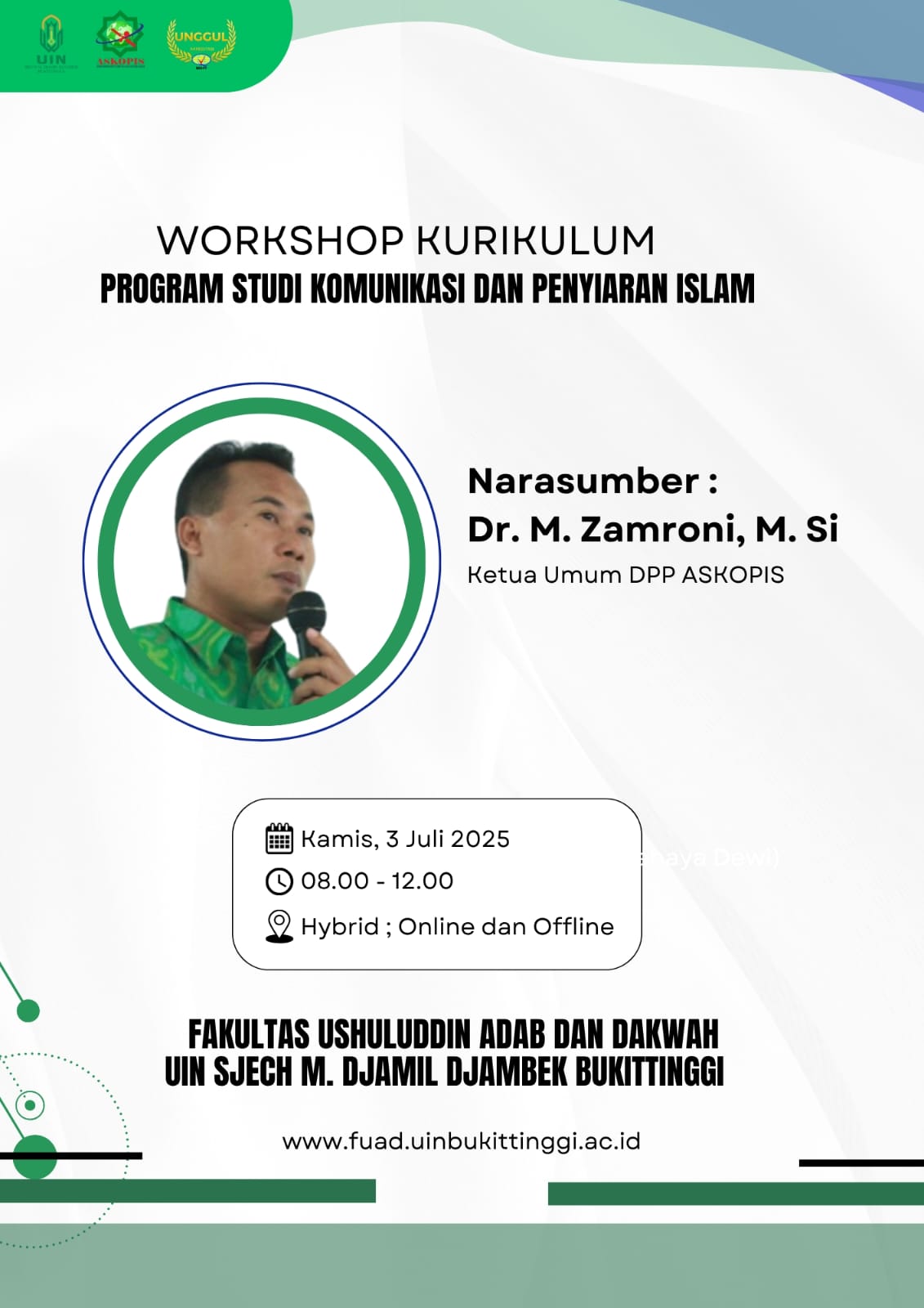 Bukittinggi, 3 Juli 2025 — Program Studi Komunikasi dan Penyiaran Islam, Fakultas Ushuluddin, Adab dan Dakwah (FUAD), UIN Sjech M. Djamil Djambek Bukittinggi menyelenggarakan Workshop Kurikulum bertajuk “Redesain Kurikulum Berbasis Outcome dengan Penerapan Nilai-Nilai Kearifan Lokal.” Kegiatan ini menjadi bagian dari upaya strategis Prodi Komunikasi dan Penyiaran Islam dalam melakukan pembaruan kurikulum agar lebih responsif...Read More