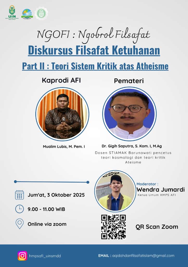 Program Studi Aqidah dan Filsafat Islam (AFI), Fakultas Ushuluddin, Adab, dan Dakwah (FUAD) UIN Sjech M. Djamil Djambek Bukittinggi kembali meneguhkan komitmennya dalam membangun tradisi intelektual melalui penyelenggaraan webinar bertema “Teori Sistem Kritik atas Atheisme” pada Jumat, 03 Oktober 2025. Kegiatan yang dilaksanakan secara daring melalui platform Zoom Meeting ini merupakan seri kedua dari rangkaian...Read More